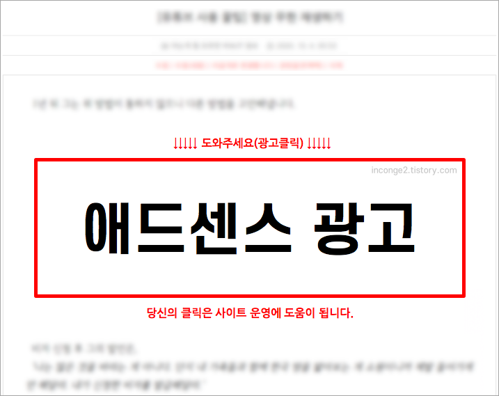 '광고클릭, 도와주세요, 추천 링크 방문, 광고 클릭으로 공익 활동 참여하기, 당신의 클릭은 사이트 운영에 도움이 됩니다, 운영자 후원하기' 등 유사한 문구 모두 포함 광고 클릭을 유도하는 내용을 작성한 경우